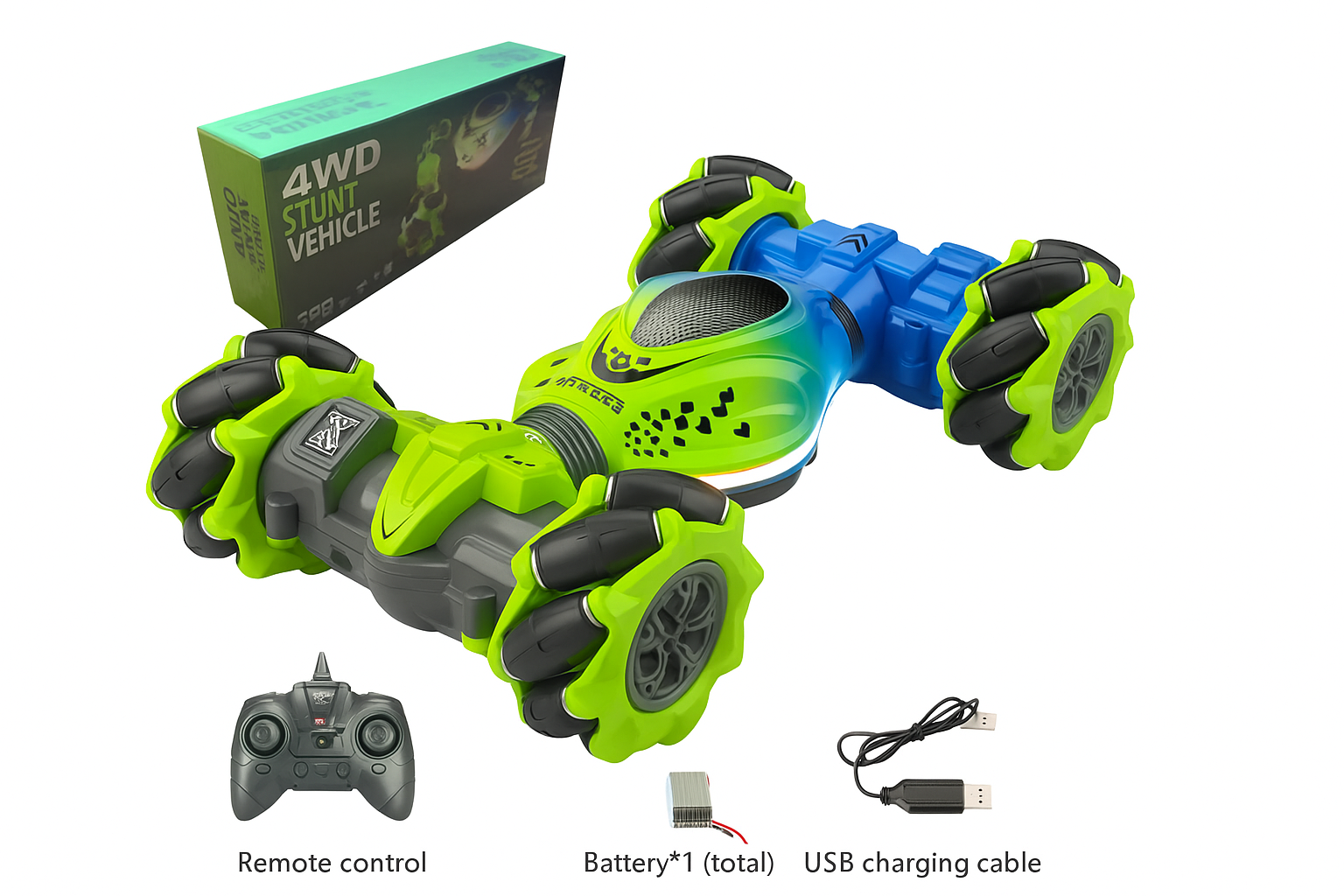 Design: All-terrain stunt car with a durable body made from high-quality metal, ABS, and plastic